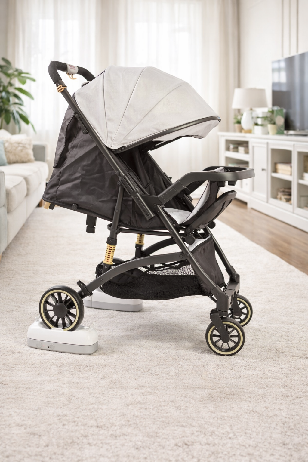 STRAP 'N' GO ROCKER: A safe, pram-mounted rocking system designed to gently comfort your baby while you take a moment for yourself.